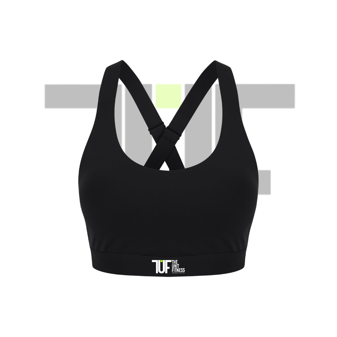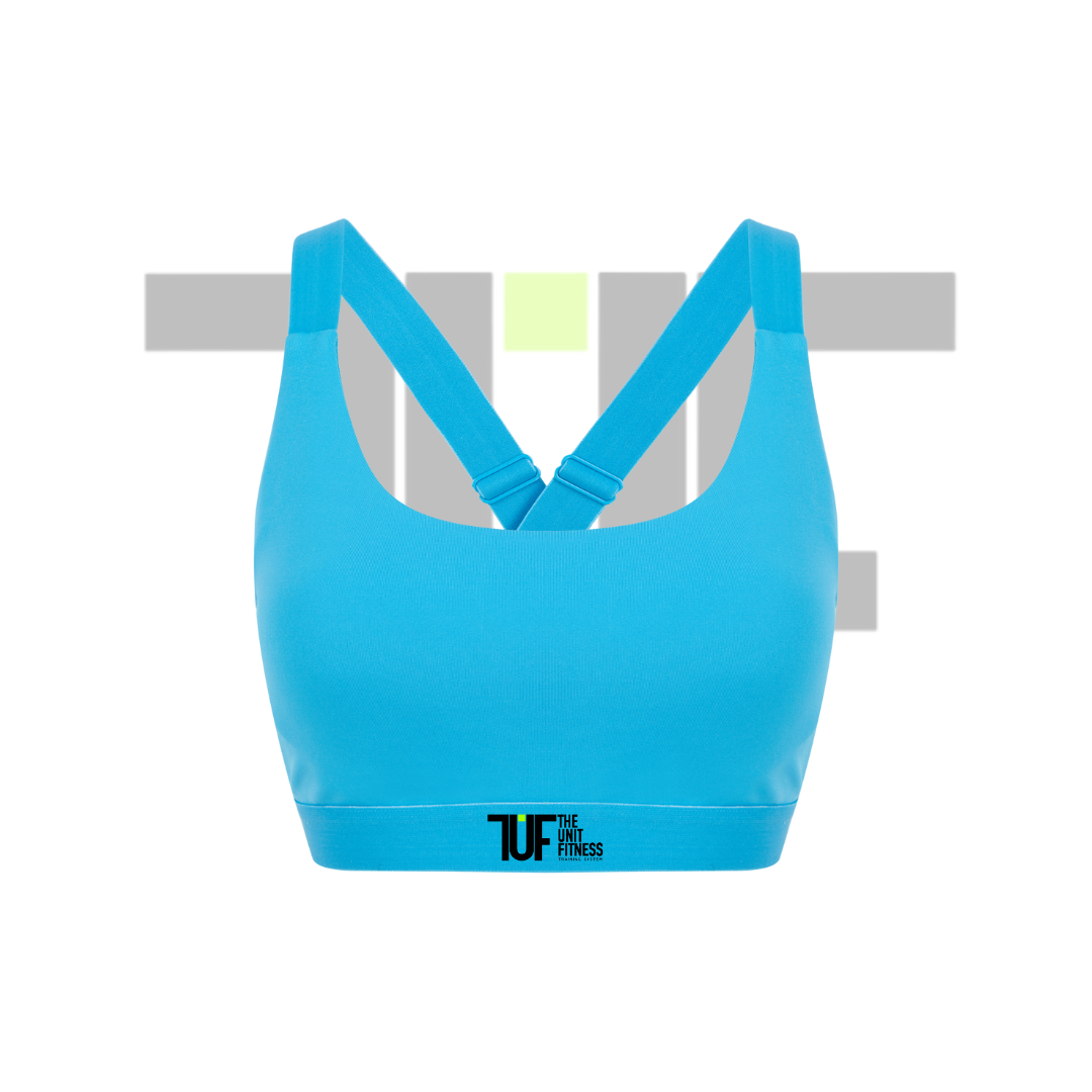 Cuello redondo con tirantes elásticos cruzados en la espalda.